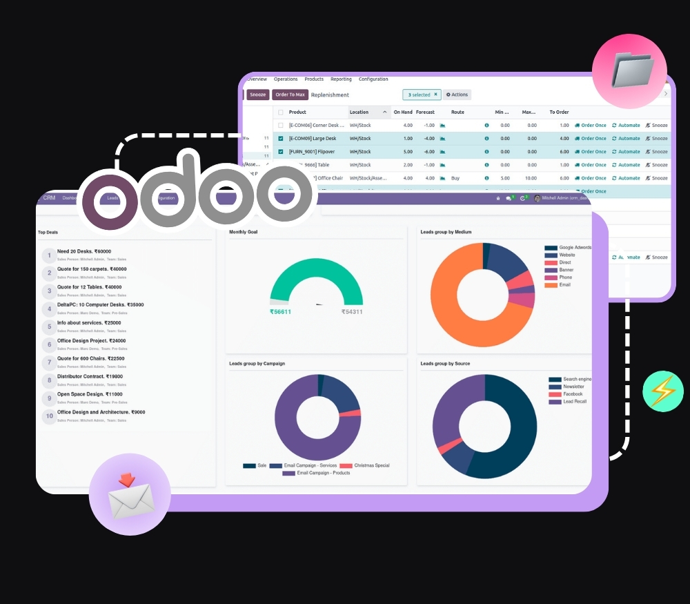L’automatisation Odoo permet de supprimer les tâches manuelles répétitives et de fiabiliser les données entre vos modules (ventes, compta, stock, production…). Résultat : moins d’erreurs, plus de productivité, et un ERP qui s’adapte à votre façon de travailler — pas l’inverse.